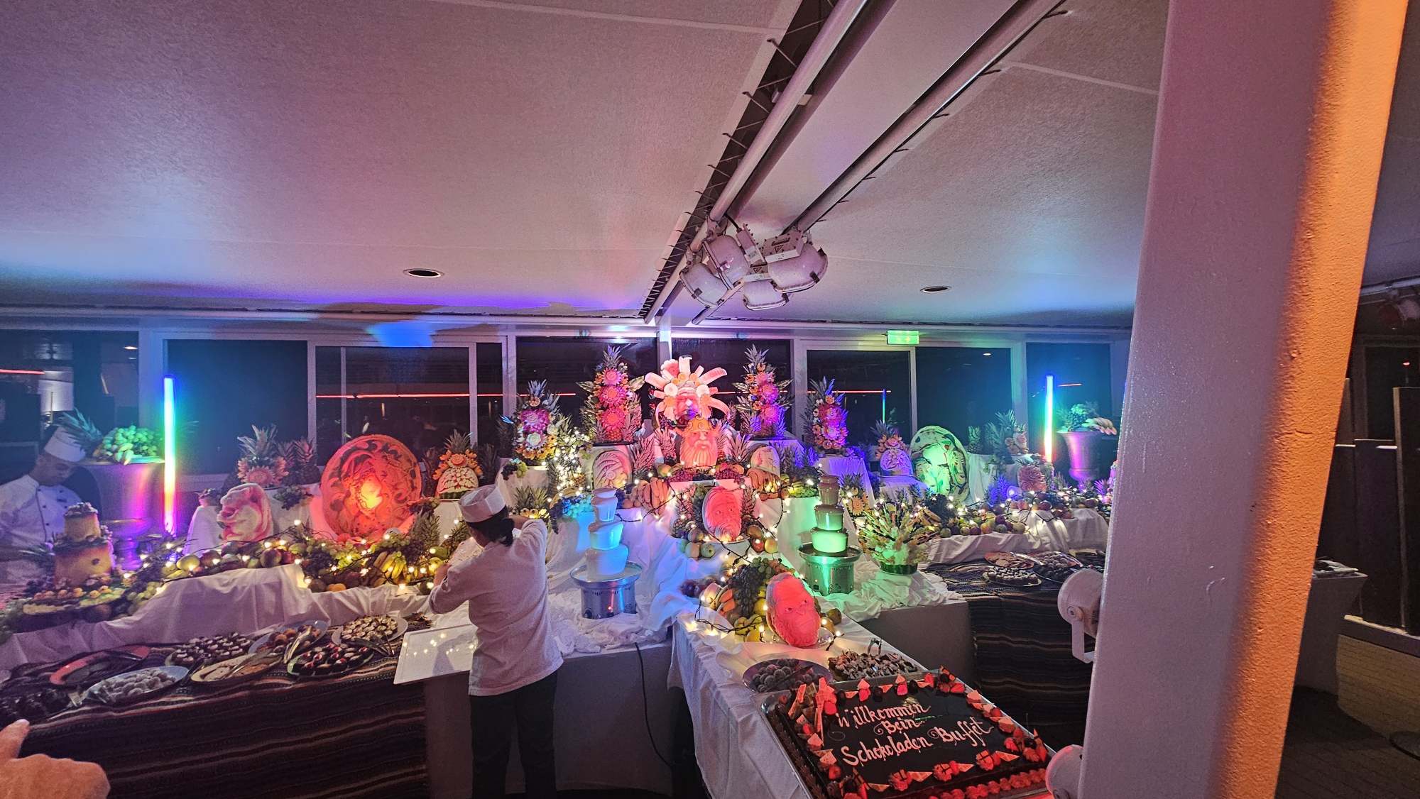 Jedoch war es auf dem Pooldeck so voll, dass wir uns, nachdem wir uns am Schoko-Buffet bedient hatten, auf unser Zimmer zurückgezogen haben und dort auf dem Balkon unsere Beute gegessen haben. Eigentlich wollten wir uns noch mal unters Volk mischen, haben aber dafür einen schönen Abend auf unserem Balkon gemacht, da die Musik hier ja auch sehr gut zu hören war.