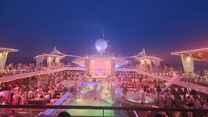 Am 2. Seetag haben wir es mal ruhiger angehen lassen und mussten die Uhren wieder zurückstellen. Am Vormittag haben wir an Gewinnspielen teilgenommen und uns die Rabatte in den Geschäften auf dem Schiff angeschaut. Dann haben wir uns noch die Show Hakuna Matata angesehen, wo sie mehrere bekannte Disney-Lieder live gesungen haben. Ursprünglich war der Plan, dass wir schwimmen wollten, jedoch war das Pooldeck so voll, dass wir keinen Platz bekommen haben. Also entschlossen wir uns, den Nachmittag in der Kabine zu verbringen und uns dort zu entspannen. Melly musste auch noch ein bisschen Schlaf nachholen.