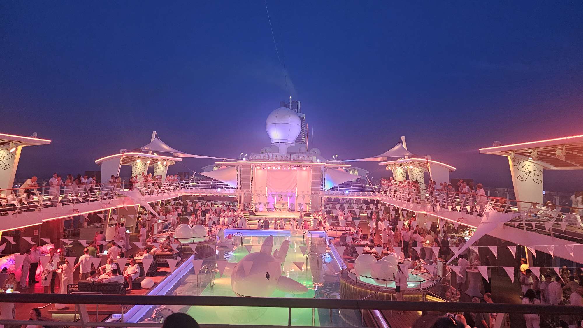 Nach einem besonders leckeren Essen in der X-Lounge war White Party angesagt. Für diejenigen, die nicht wissen, was das ist: Man kleidet sich möglichst ganz in Weiß, und es gibt Musik vom DJ mit einem riesigen Schoko-Fondue-Buffet. Man kann Bilder mit einer Vespa machen und richtig am Pool abfeiern. Uns war es jedoch am Ende zu voll, sodass wir einen schönen Abend auf unserem Balkon verbracht haben. Dort hat Melly ein Buch gelesen, das so gut war, dass sie es bis kurz nach 1 Uhr fertig gelesen hat. Jason hat schon lange geschlafen.